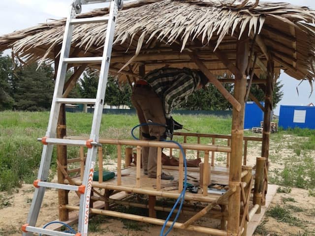 Wie erfolgt die Montage Bambus Gartenmöbel? Nach Absprache eines geeigneten Liefertermins werden wir Ihnen Ihre gewünschte Bambus Liege, Bambus Bar oder Ihren Bambus Pavillon liefern. Dazu wird ein zweiköpfiges Aufbau- und Montageteam den, je nach örtlichen Gegebenheiten in Einzelteile zerlegten, oder bereits vormontierten Bambus Pavillon, in einem größeren Transporter zustellen. Die vorgefertigten Salas, Bars oder Pavillons werden von uns zunächst im Lager ohne Dachkonstruktion zusammengebaut und alle Verbindungen fest miteinander fixiert. Das komplette Rahmengestell mit circa 2 mal 2 Metern Grundfläche und circa 2 Metern Höhe wird dann am Stück geladen und bei Ihnen zum gewünschten Aufstellplatz getragen. Dementsprechend benötigen wir dazu geeignete und großräumige Zugangsmöglichkeiten. Am Wunschort angekommen werden wir dann nur noch das Dach aus Palmenblättern hinzufügen.